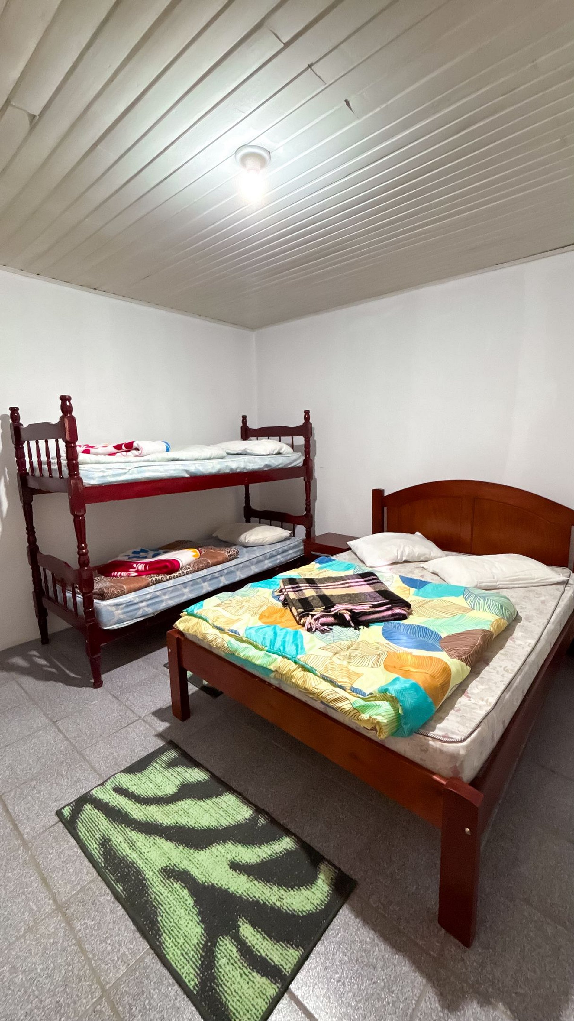 Um quarto com cama de casal e um beliche de solteiro para duas pessoas.