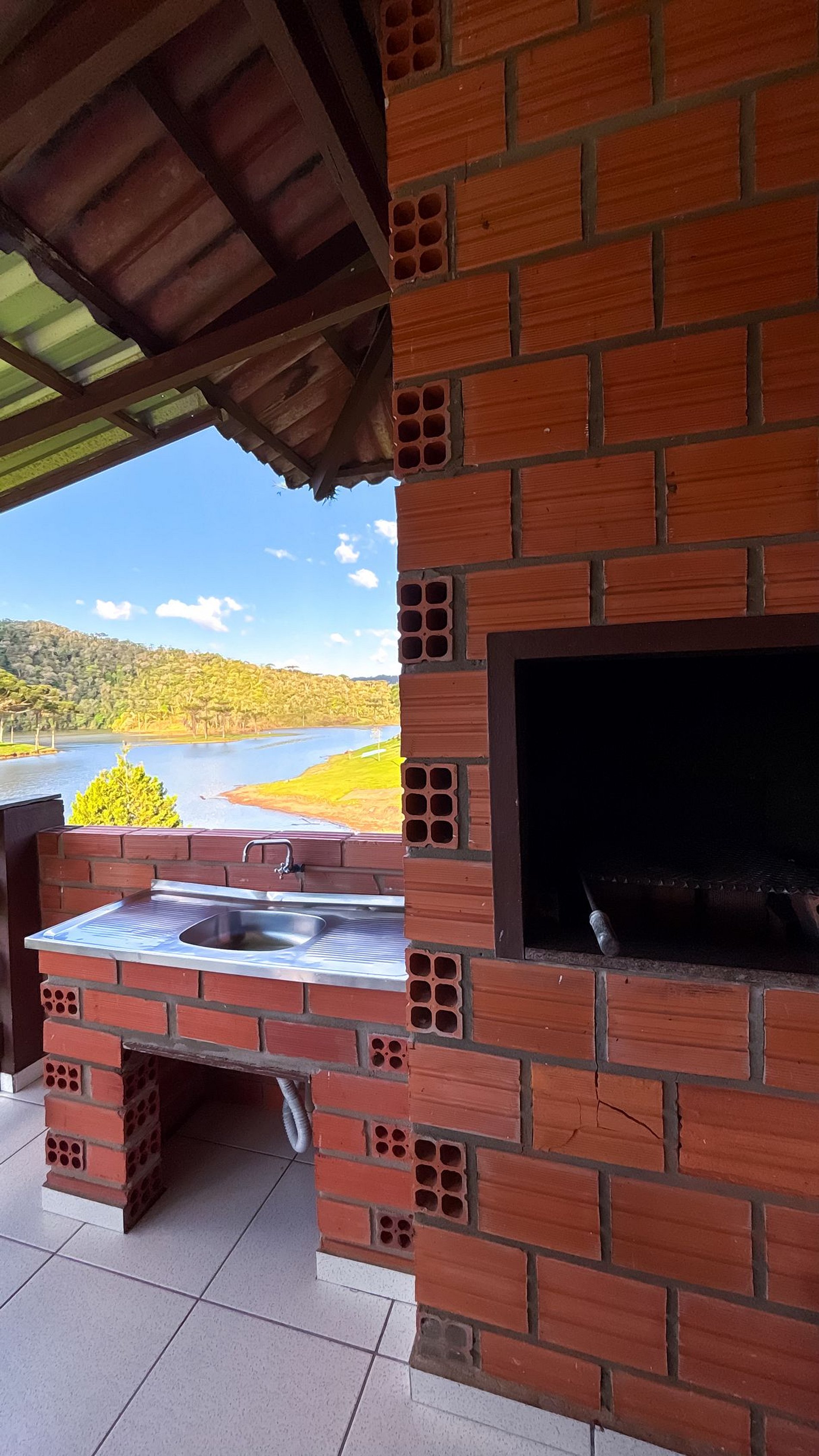A varanda conta com uma churrasqueira exclusiva, e mesas para as refeições, perfeito para um churrasco apreciando a paisagem.